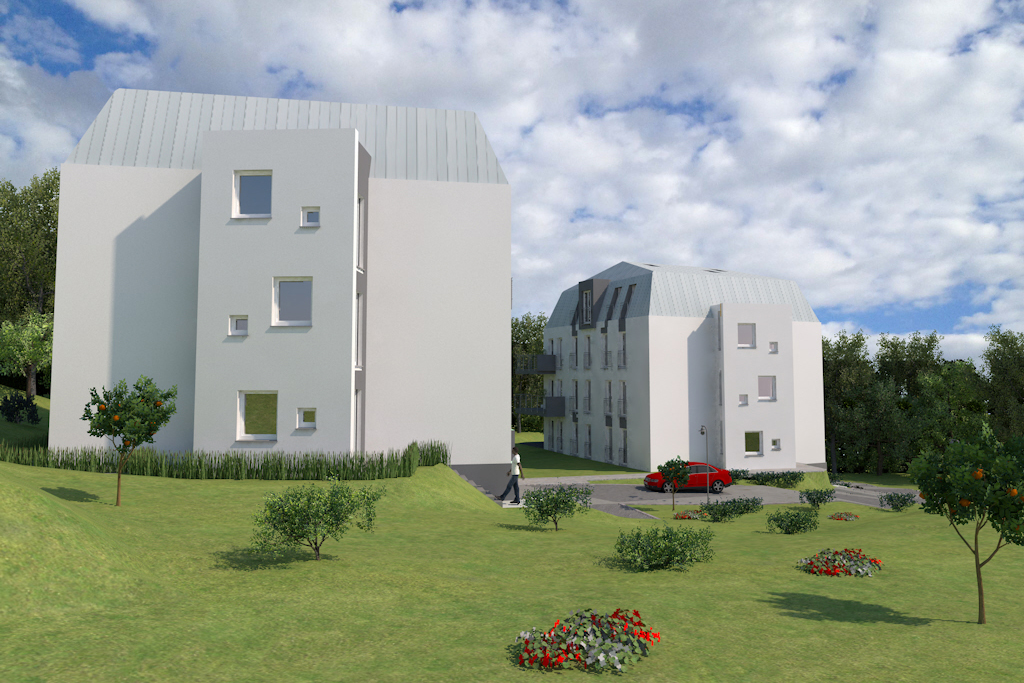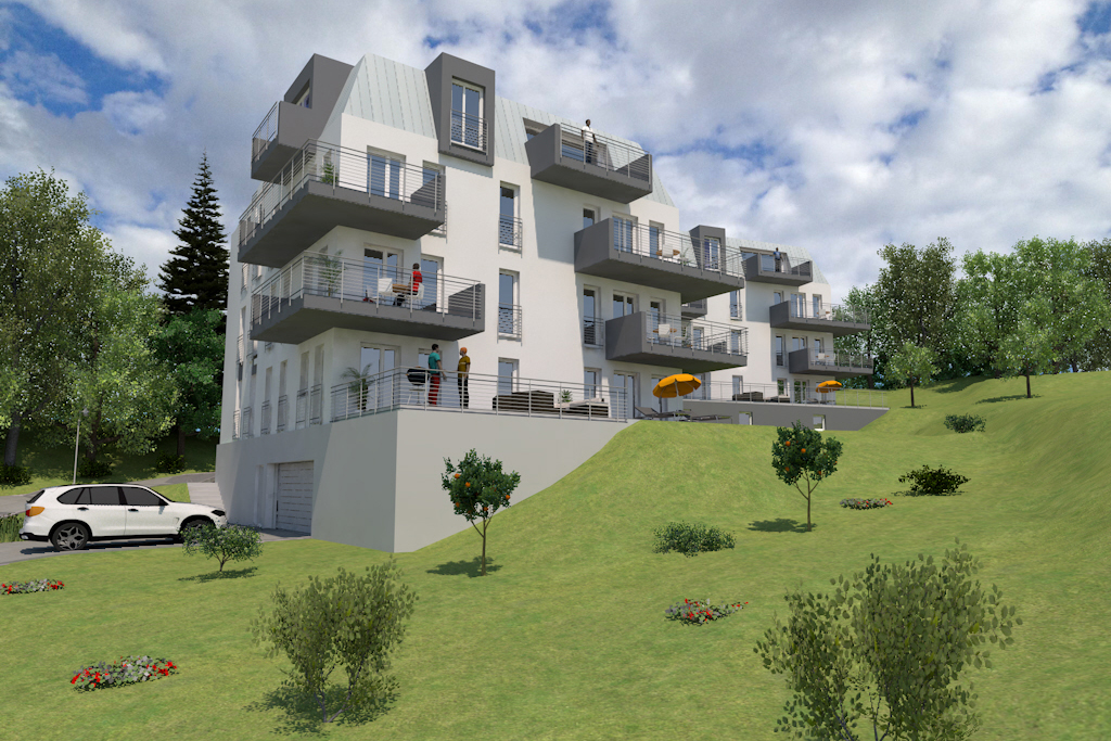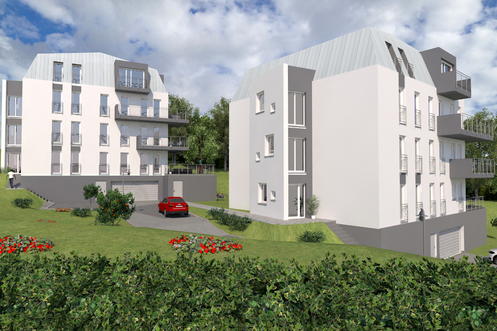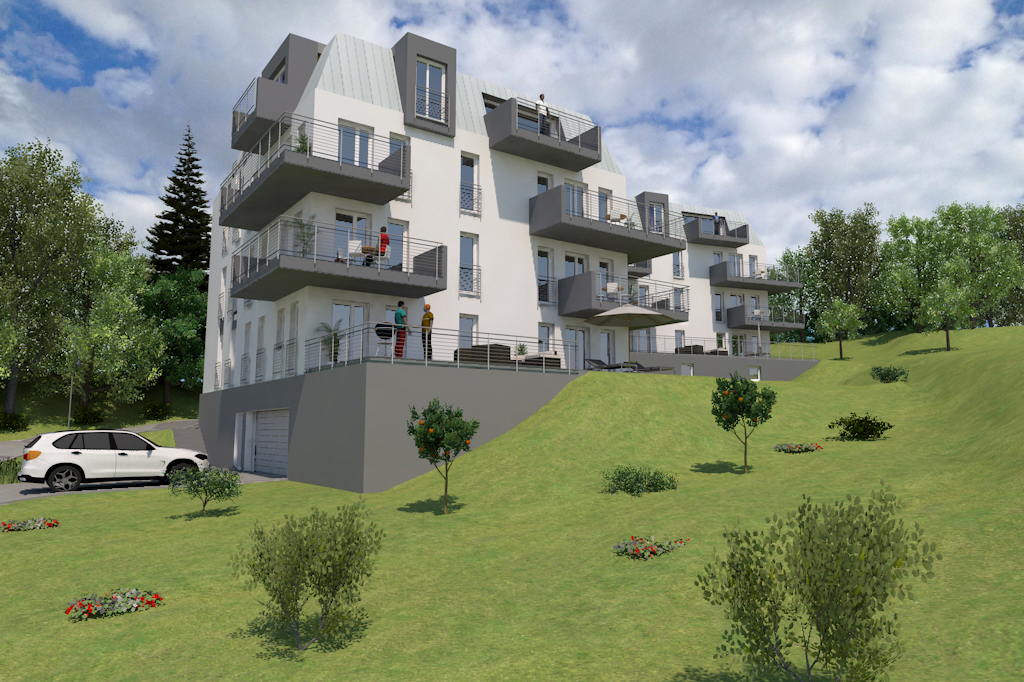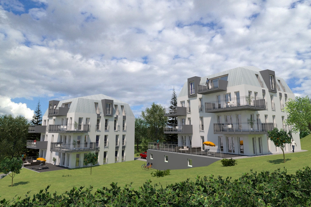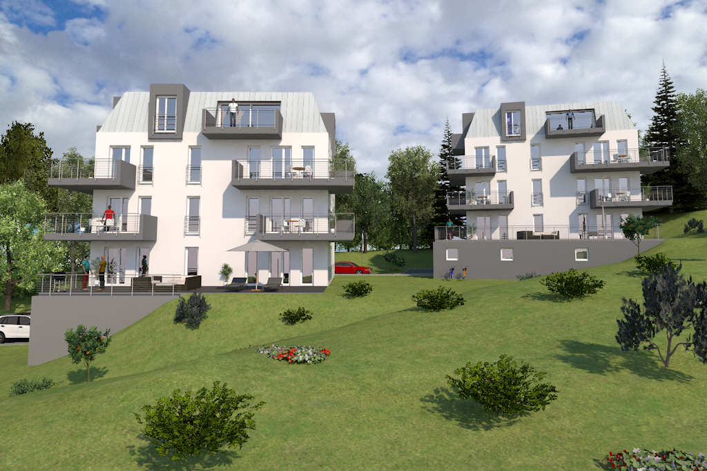 Die Dachgeschosswohnungen bieten durch das Mansardwalmdach mit den besonders steilen Dachschrägen auf der gesamten Grundfläche des Haues extra viel Wohnraum sowie insgesamt sieben Balkons für einen Rundum-Blick in den Bayerischen Wald. Die beiden Häuser verfügen über eine Tiefgarage, in der sich zahlreiche Stellplätze und Kellerabteile befinden.
